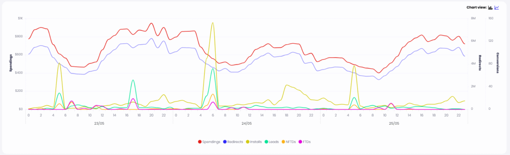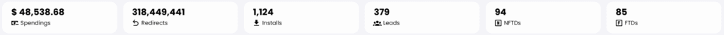 Performance Metrics: Track key indicators like Redirects (total clicks), Spendings (total campaign spend), FTDs (First-Time Deposits), Installs (app installs), Leads (sign-ups or form submissions), and NFTDs (Non-First-Time Deposits) for your selected time period.